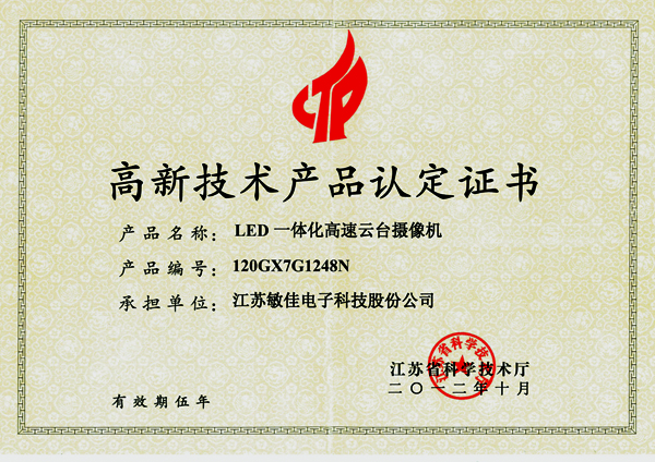 2012年10月,我公司LED一體化高速云臺攝像機獲得由江蘇省科學技術廳頒發的“高新技術產品認定證書“,編號為:120GX7G1248N。這標志著敏佳高速云臺攝像機在技術創新上邁上了一個新的臺階,同時也是對敏佳高速云臺創新技術實力的充分肯定。 這也是我公司堅持自主創新,積極推進技術現代化,取得的優秀成果。一直堅定不移的走自主創新之路,在研發上投入了大量的人力物力,積極開發具自主知識產權的核心技術與產品。